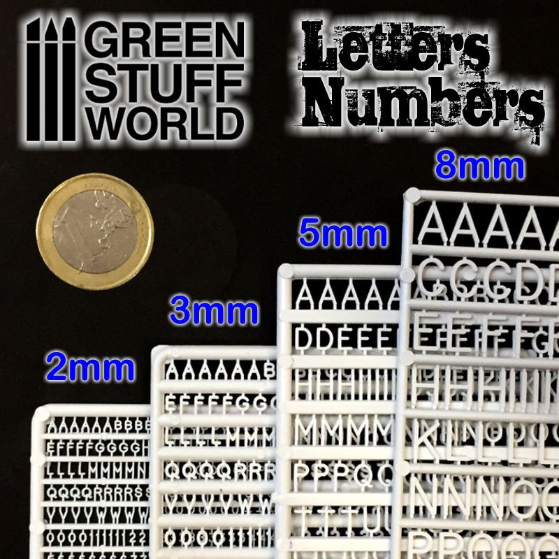 Molded styrene letters and numbers to make your own raised letter signs. This set includes the following letters and numbers: AAAAAABBBBCCCCDDDDEEEEEEFFFFGGGGHHHHIIIIJJJJ KKKKLLLLMMMMNNNNOOOOOPPPPQQQQRRRRSSSSSTTTT UUUUVVVVWWWWXXXXYYYYZZZZ 0000111111222233333333444455556666777788889999&& Scale Dimensions (inches) Height N HO S O G 2mm ( 0.079") 12,5 7 5 4 2 3mm ( 0.118") 19 10 7,5 6 2,5 5mm (0.197") 31,5 17 12,5 9,5 4,5 8mm (0.315") 50 27,5 20 15 7 Scale Dimensions (cm) Height N HO S O G 2mm 31,75 17,78 12,7 10,16 5,08 3mm 48,26 25,4 19,05 15,24 6,35 5mm 80,01 43,18 31,75 24,13 11,43 8mm 127 69,85 50,8 38,1 17,78