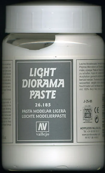Formulated with acrylic polymer, micro spheres and titanium white to produce a lightweight but high viscosity, matt and opaque product for the creation of volumes and structures in dioramas. Water resistant when dry.