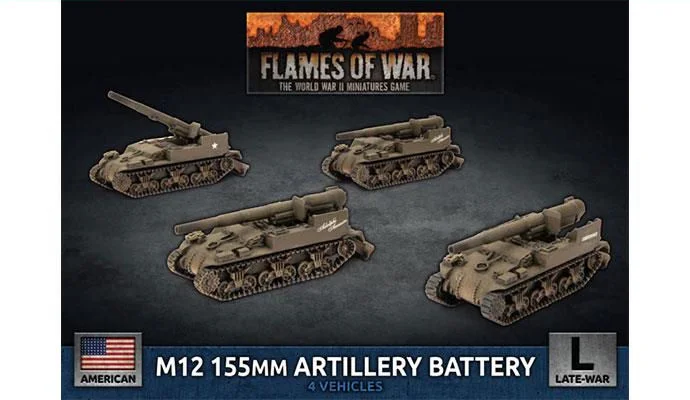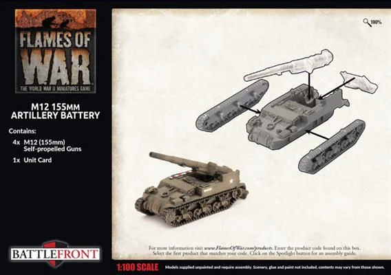 includes four resin and metal M12 (155mm) Self-propelled Guns, one Plastic Gun Crew Sprue and one Unit card.