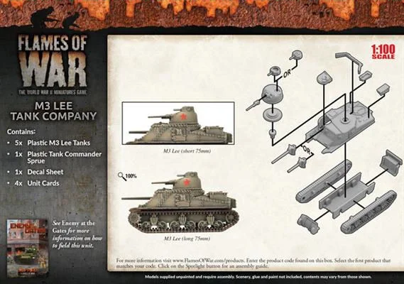 includes five plastic M3 Lee tanks, one plastic Tank Commander sprue, one Decal sheet and four Unit Cards.