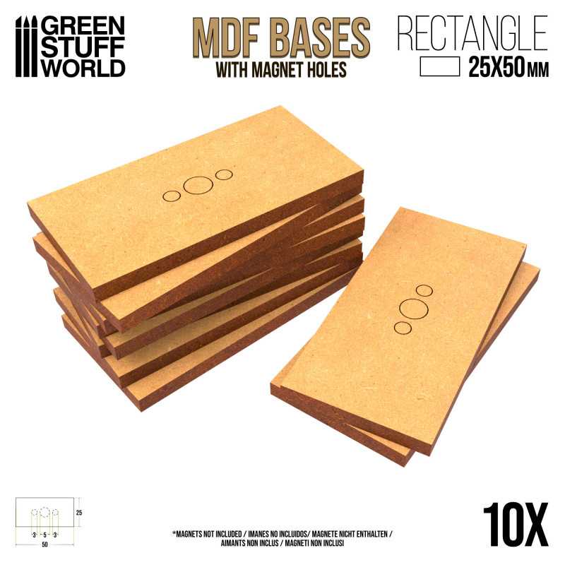 Top quality MDF bases with magnet holes for mounting wargames figures. Shape: RECTANGLE Thickness: 3mm Bases: 10 per pack