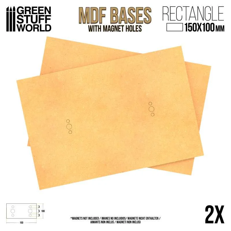 Set of high precision laser cut MDF wooden bases. Ideal for modelling, wargaming, role playing, miniatures, etc. Shape: RECTANGLE Thickness: 3mm Bases: 2 per pack