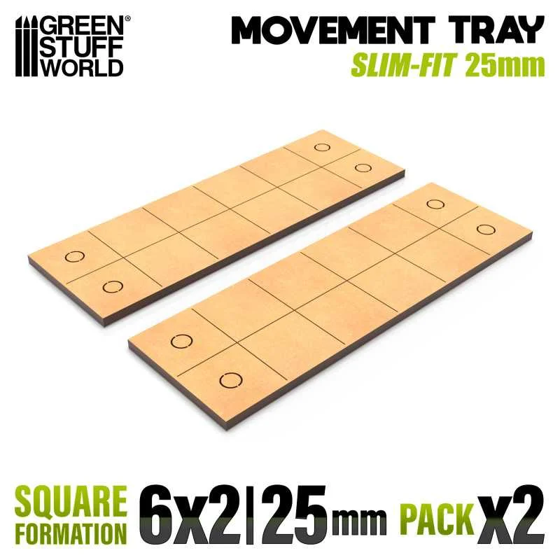 MDF movement trays for 25 mm square bases or multiples of this size are very popular among wargame and miniatures game enthusiasts as they provide stability in the displacement of troops, customization by unifying the formations of the units of your armies, in addition to their great compatibility with a multitude of game systems. They serve as a solid base for assembling, transporting, and displaying your wargame figures, enhancing both the gaming experience and the visual aesthetics of the battlefield. They help maintain a level playing field and accurately measure distances and unit displacements. This set is made of MDF wood and laser-cut with high precision. The base grid has been engraved to facilitate the placement of the figures and also has no edge, SlimFit design, so the minis are completely glued to the edge of the movement bases so that, no empty space is created when joining two units facing each other. They also incorporate a new system with pre-cut holes so you can easily open holes without using a modeling hand drill, where you can insert 5x2mm or 5x3mm neodymium magnets that will help you fix the trays of your miniature carry case. They are also compatible with the magnet sheets that would be glued on the lower part and with the metal sheets for magnets that would be glued on the upper part. In this way, the magnetized miniatures would be attached directly on top, and the whole set with the mini to the metal tray of the carrying case. Shape: Square Thickness: 3mm Bases: 2 per pack