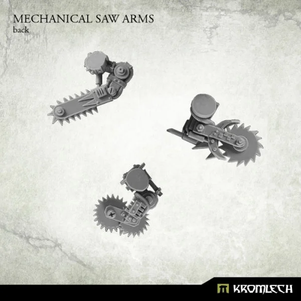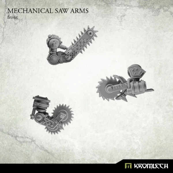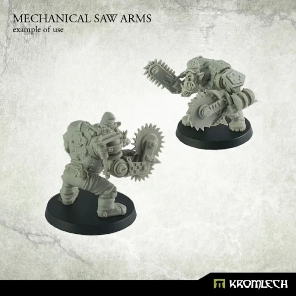 This set contains six brutal mechanical saw arms (2 of each design) for use with orcs or other 28mm heroic scale miniatures. There are two right arm designs and one left.