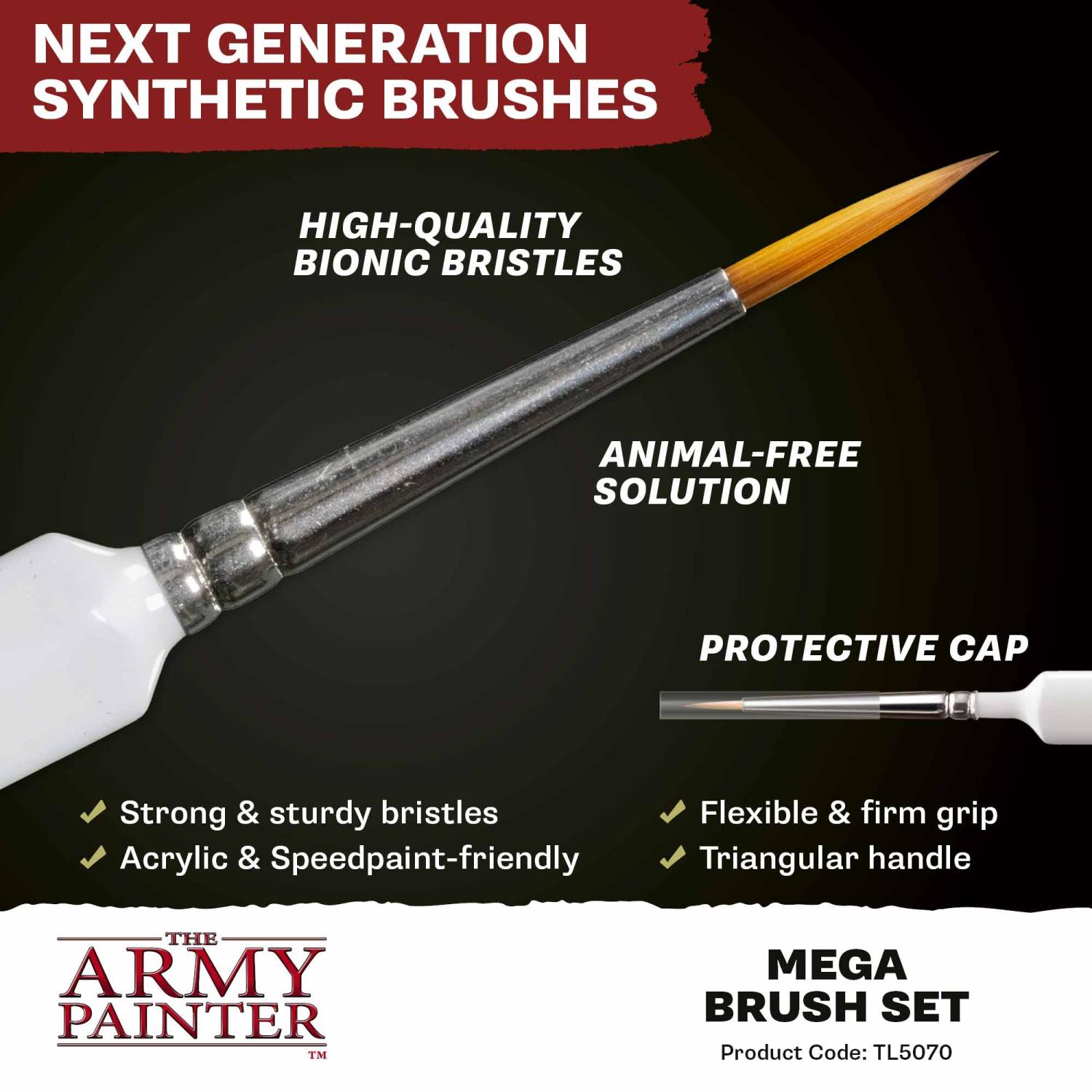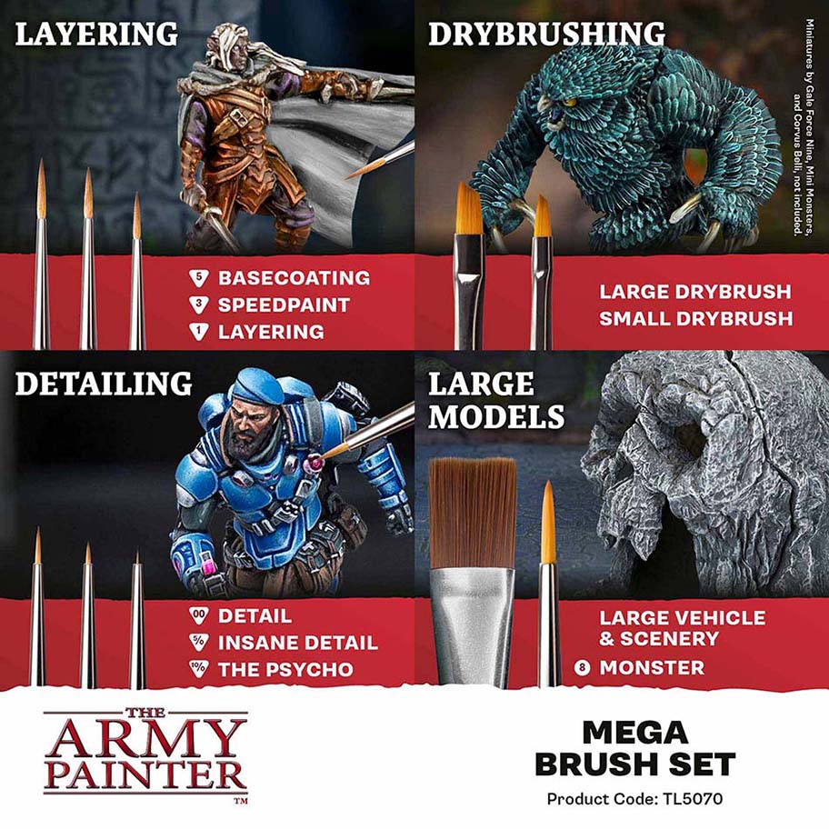 Everything you need to paint anything. The Mega Brush Set brings together our most-used brush types—detail, layering, basecoating, and drybrushing—so you can move from tiny symbols to vehicles and terrain without missing a step. Durable, easy-to-control bristles keep their shape and deliver smooth coverage. Packed in updated, eco-friendly packaging that keeps your tools organised between sessions.