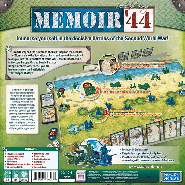 Memoir '44 includes over 20 different battle scenarios and features a double-sided hex game board for both beach landings and countryside combat. Each scenario mimics the historical terrain, troop placements and objectives of each army. Commanders deploy troops through Command and Tactic cards, applying the unique skills of his units -- infantry, paratrooper, tank, artillery, and even resistance fighters -- to their greatest strength.