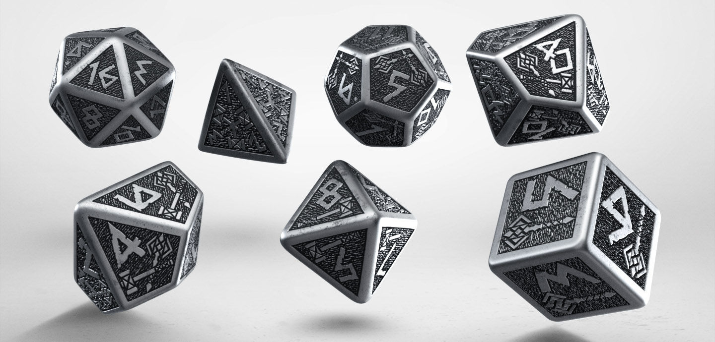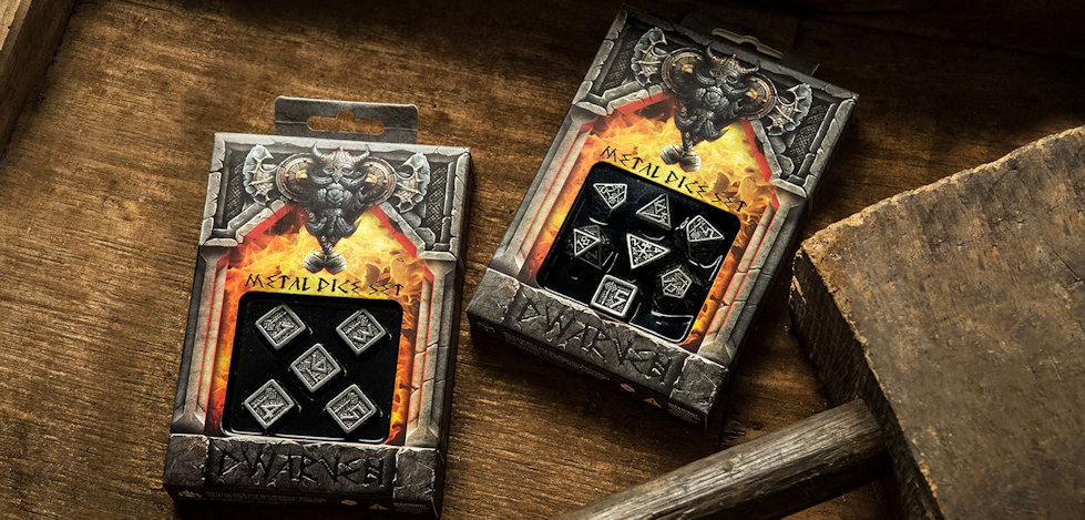 There are legends about wonderful items made of purest metal from live Mother Earths veins, hidden deep in dwarven mines. These legends are true. We, the Q WORKSHOP, went on quests to many dark places and found a map to a long lost forge of the Smashhammer blacksmith. Our emissaries have found there huge brassware gates to his foundry. These doors were hiding crates of Metal Dwarven Dice Sets, engraved with sacred symbols of the dwarven folk, made of top tin. Seven dice with engraved hammers and axes for seven hails for their god. These dice are sturdy as mountains and eternal as such. Real bones of the world, indestructible, heavy as most precious nuggets and made of tin minted from rivers of melted lava, by many brave dwarves who lost their lives in pursuit of perfection. But in those dice brave miners will live forever. We salute the heroes by putting a Symbol of Brassware Gates on the elegant boxes. This is our memorial for all tough as nails bearded folks. So you buy something more than game tool, you buy a Legend.