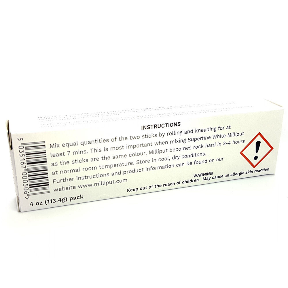 Milliput is a two-part, cold setting, non shrinking epoxy putty sold in cartons containing 113.4gm. One 56.7gm stick of each part. We produce five grades of Milliput: Standard (Yellow/Grey), Terracotta, Silver Grey, Black and Superfine White.