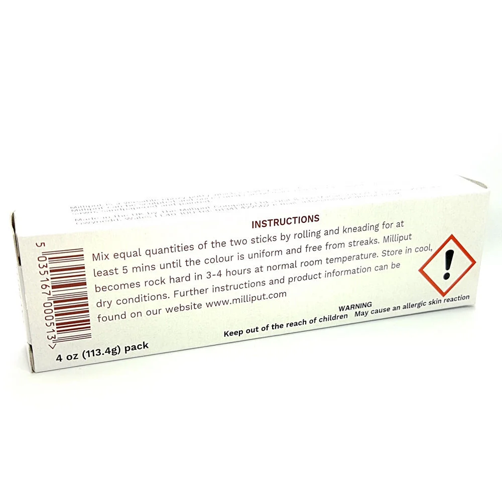 Milliput is a two-part, cold setting, non shrinking epoxy putty sold in cartons containing 113.4gm. One 56.7gm stick of each part. We produce five grades of Milliput: Standard (Yellow/Grey), Terracotta, Silver Grey, Black and Superfine White.