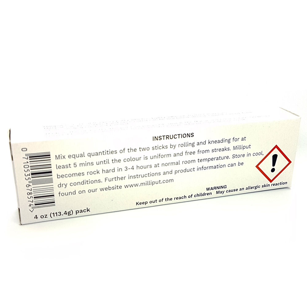 Milliput is a two-part, cold setting, non shrinking epoxy putty sold in cartons containing 113.4gm. One 56.7gm stick of each part. We produce five grades of Milliput: Standard (Yellow/Grey), Terracotta, Silver Grey, Black and Superfine White.