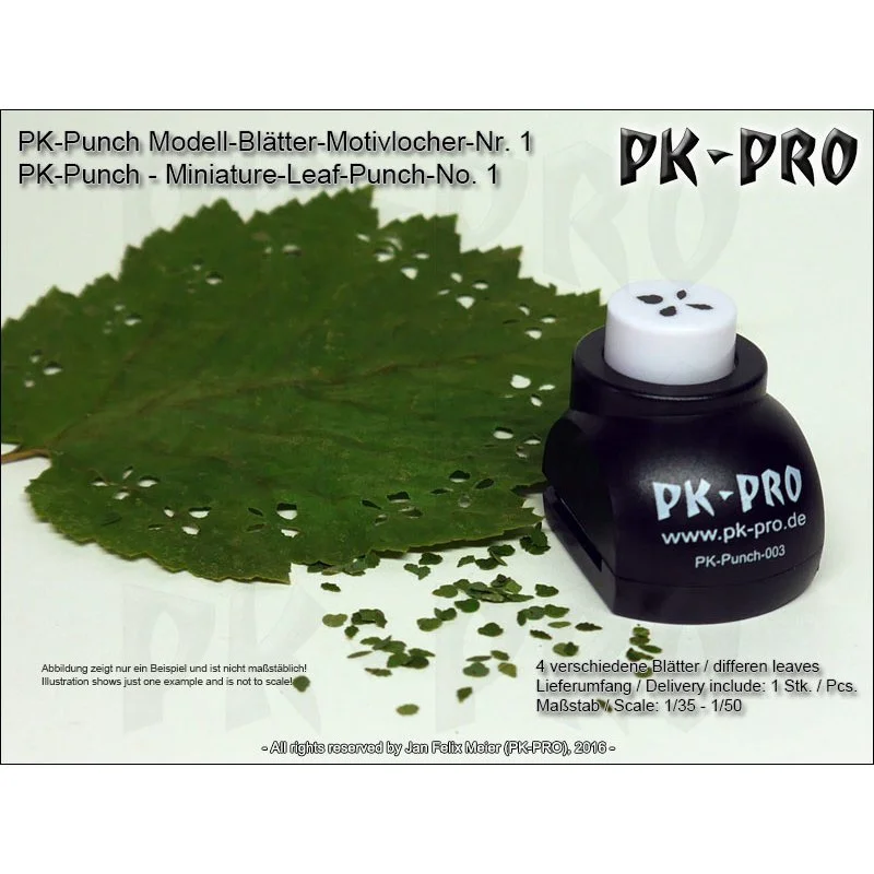 PK-Punches are perfect to create a large number of miniature sheets in a short time. The leaves created are suitable for use in scale 1/35, 1/43, 1/48 and 1/50 (corresponding to 54, 32 and 28 mm miniatures).