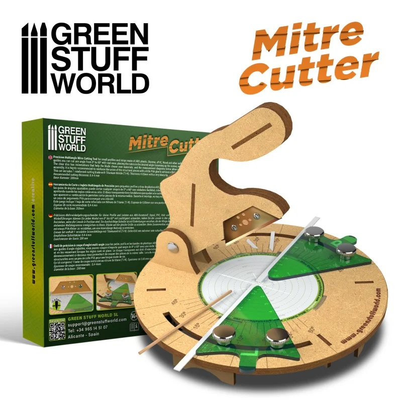 MDF MITRE CUTTER TOOL Precision Multiangle Mitre Cutting Tool for small profiles and strips made of ABS plastic, Styrene, uPVC, Wood, and other soft materials. Using the adjustable angles guides you can cut any angle from 0º to 60º with real ease, placing the rulers in the desired angle loosening up the screws, and tightening when the rulers are in place. The clear disc has indentations that help the blade cleave over materials, and the measurement diagrams below allow you to cut pieces to the same size. During assembly, It is highly recommended to reinforce the union of the structural pieces with a little PVA glue to achieve a lifetime of use. This set includes 1 reinforced cutting blade with Titanium Nitride (Ti-N). Blade thickness 0.65mm with a very sharp tip. Recommended cutting thickness: 0.4-4 mm Base diameter: 200mm Total weight: 400gr.