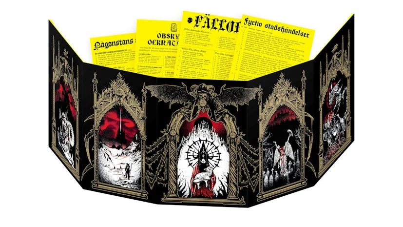 Dölj dina intentioner och/eller håll koll på dina slumptabeller med det här monstret till spelledarskärm för användande med rollspelet MÖRK BORG. *Ett vedervärdigt altarskåp av fem stående A5-paneler, vars framsida pryds av fem scener ur den döende världen; från HON bland Bergen Chrypts eldsfrustande bergstoppar, till den ändlösa kyrkogården Graven-Tosk i skuggan av Skuggkungens ruinpalats. *Spelledarens sida har en bred arsenal av tabeller och regelsummeringar som kan komma väl till hands under spelets gång, såsom en SLP-generator, utrustning och Krafter, stridssummering (med en frivillig träfftabell), generiska fiender och en t100-tabell över diverse bråte som kan hittas när kultisternas koffertar plundras. *Bestyckad med två par fotohörn som kan hålla A5-sidor på plats, så att du kan skräddarsy skärmen med vilka tabeller eller anteckningar du än kan tänkas behöva. Två dubbelsidiga extra-A5 följer med skärmen.