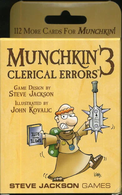 MUNCHKIN 3 - CLERICAL ERRORS (Expansion 112 kort) ''You wanted more Munchkin, so here it is! Created by Steve Jackson and illustrated by John Kovalic . . . Munchkin 3 - Clerical Errors has 112 more cards for the best-selling game of killing monsters and taking their stuff. Play a new race: Gnomes! Try on the Bard class. Face the Tequila Mockingbird, the Bad Ass, and the dreaded Auntie Paladin! Equip yourself with amazing items like the Chainmail Bikini and the Stab-A-Matic . . . and show them who's the mightiest, munchkinest dungeon delver of them all. And this set has a special treat. We asked five of our favorite Comic Guys to do one card each. So in this set you'll find: Phil Foglio's Magnificent Hat Pete Abrams' Perfectly Ordinary Rabbit Tom Ricket' s Stick Figure Jon Rosenberg's Fowl Fiend and Randy Milholland's Redneck Tree!''