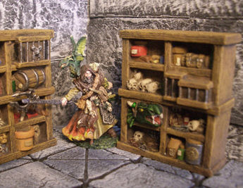 "The Necromancer shelf suitable for both in a dungeon, as well as a decoration in a building, room or a diorama. The shelf is molded from high-quality resin and comes unpainted. The shelf includes scrolls with recipes for potions and ointments. But there are also skeletonized animal and human skulls and various storage containers such as pots, jars and amphorae. Top right is a cage with a laboratory rat.