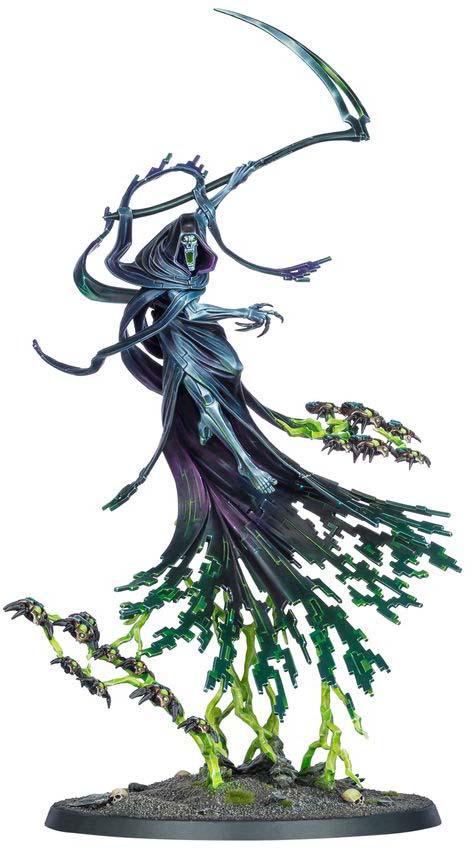 The Nightbringer was once death incarnate – a sadistic god with the power to unmake the stars and a hunger for the life of the galaxy. Like its fellow C’tan, it was shattered by the Necrons, and its insane fragments have ever since been enslaved by those it once ruled. A single shard of the Nightbringer can destroy entire armies. They extrude scythe‑shaped blades from their necrodermis, using them to cull their enemies with great sweeps of entropic unmaking. Their very gaze, meanwhile, is death itself, capable of leeching the essential animus from their victims.