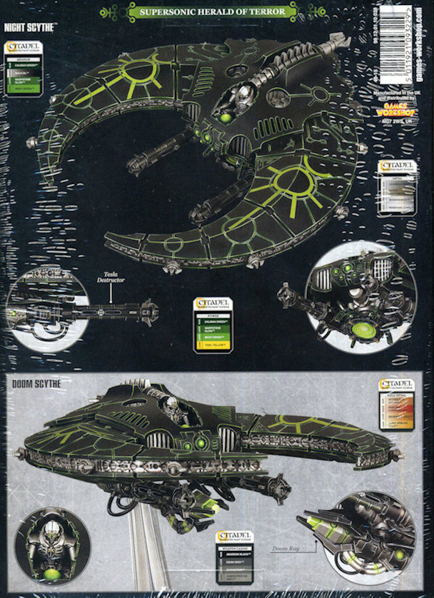 Doom Scythes är härolder för terror och fasa, överljudsplan som rör sig långt före Necron-invasionen. Doom Scythes opererar på ett högst oberoende sätt, dess flygkropp innehåller massiva datorenheter som lagrat oräkneliga attackplaner, strategier och taktiska varianter att styra farkosten. När en pilot utsätts för en situation han inte är van vid kan han snabbt koppla upp sig mot dessa datorer och välja rätt respons. Tack vare den hänsynslösa precisionen i pilotens androidhjärna kan han simulera och välja rätt strategi på några få nanosekunder. Night Scythes är Necrons favoritverktyg för invasioner, en variant av Doom Scythes som ersätter några av de tyngsta vapnen till förmån för kapacitet att transportera trupper. Därmed inte sagt att Night Scythes är tandlösa - tvärtom. Med sin twin-linked tesla destructor och det nervknäckande skriket från dess motorer är Night Scythes fortfarande en formidabel krigsfarkost. Som befälhavare över din Necron-armada kommer du finna att kombinationen av Doom Scythes och Night Scythes kan hjälpa dig att planera stridssituationen. Doom Scythes kan skickas långt i förväg fdär deras dödsstrålar kan bryta upp fiendens linjer och eliminera hot från ovan. När fiendens infanteri sedan blivit decimerat kan du njuta av fiendens fasa när de märker en Night Scythe som flyger in och börjar telportera in Necron Warriors från sin maskhålsteleportör rakt in i striden. Förpackningen innehåller 51 komponenter som du kan använda för att sätta samman en Necron Night Scythe eller Necron Doom Scythe. Dess vapen inkluderar en twin-linked tesla destructor samt en death ray. Förpackningen innehåller en pinne samt passande oval bas för flygande farkoster samt en Necron transfer-karta med markeringar som du kan sätta på genom att blötlägga.