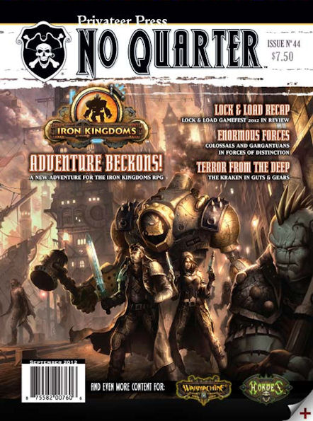 No Quarter #44 features a battle report of gargantuan proportions, as Circle Orboros and Trollbloods meet head to head with their new super-sized warbeasts in tow. Also in this issue, Guts & Gears focuses on the terrifying Cryx Kraken, Gavyn Kyle heads to Ios with a revealing dossier on Dawnlord Vyros, and support for the IK RPG continues with a full-length Iron Kingdoms adventure!