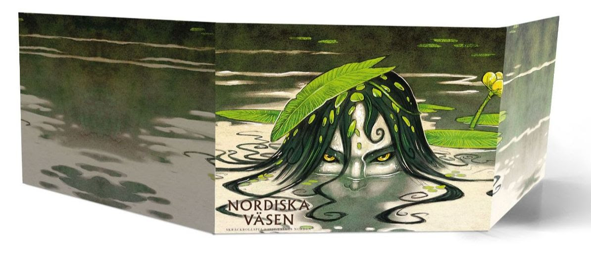 En lyxig spelledarskärm till rollspelet Nordiska väsen i praktiskt landskapsformat. Utsidan visar en stor illustration av Johan Egerkrans och insidan innehåller tabeller och information som underlättar spelet.