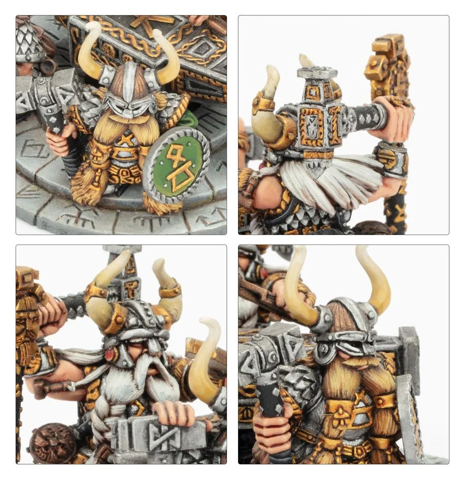 This multipart metal kit builds one Anvil of Doom with three crew, an attendant, and a forge for use in Dwarfen Mountain Holds armies in Warhammer: The Old World. The huge metal anvil sits atop a large, circular stone platform inscribed with ancient runes. Two Dwarfs stand guard by the anvil, while a third hammers a weapon atop the anvil and an attendant stokes the forge fires. Get ready to strike the anvil and unleash grudge-fuelled magic on the battlefield.
