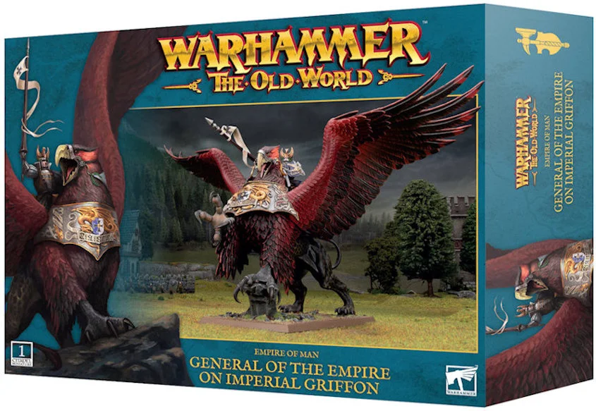 This multipart plastic kit builds a General of the Empire on Imperial Griffon for use in Empire of Man armies in games of Warhammer: The Old World. The kit includes 2x head options for the General of the Empire, and they can be built with a sword or lance, and a shield. There are also parts to build the Griffon with a second head. Alternatively, this kit can build a Wizard Lord on Imperial Griffon.