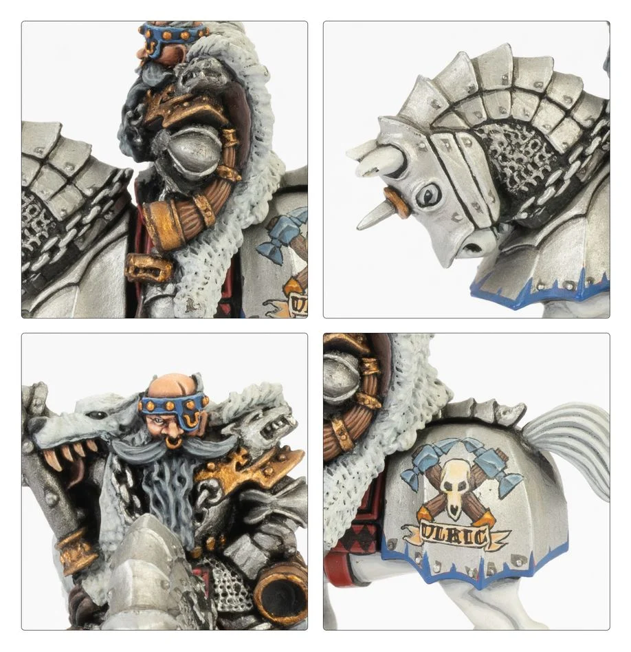 The Knights of the White Wolf are loud and brash warriors who follow the creed of Ulric – the god of battle, wolves, and winter. They carry no shields and eschew the use of a lance, instead preferring mighty warhammers to smash the skulls of their foes. This multipart metal and plastic kit builds a Grand Master of the White Wolf – a mighty leader for use in Empire of Man armies in games of Warhammer: The Old World. This long-bearded warrior rides to war sporting a fine white wolf cloak, and swinging a brutal wolf hammer. This kit contains 1x metal and 4x plastic components, and 1x Citadel 30mm by 60mm Rectangular Slotta Base. This miniature is supplied unpainted and requires assembly