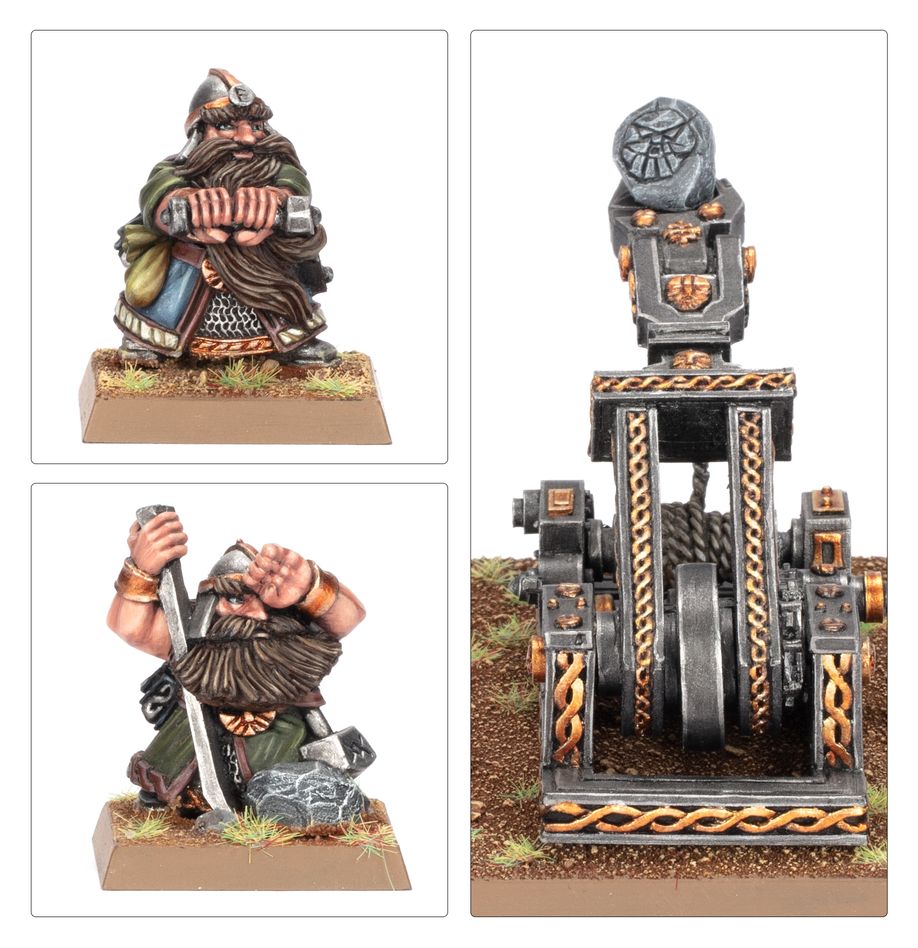 This multipart metal kit builds a mighty catapult for your Dwarfen Mountain Holds army, and a crew of three to operate it. Though fairly straightforward, the engineering excellence of the Dwarfs makes it an effective example of the design, and they can be further enhanced with runes to offer a variety of boosts and bonuses. Any self-respecting Dwarf army deserves at least one. This kit contains 14 metal components, and comes with 1x Citadel 50mm by 75mm Rectangle Base, and 3x Citadel 25mm Square Slotta Bases. These miniatures are supplied unpainted and require assembly