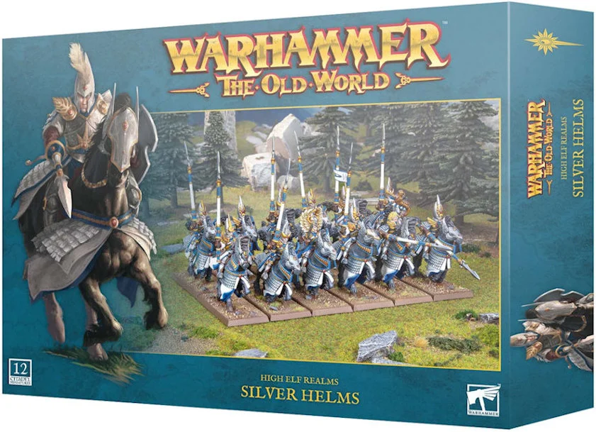 This multipart plastic kit builds 12 Silver Helms, elite heavy cavalry for your High Elf Realms armies in games of Warhammer: The Old World. These mighty mounted warriors and their horses are clad in gleaming scale mail, with tall shields and lances for riding down their quarry. They are ideal for leading charges and smashing through enemy lines.