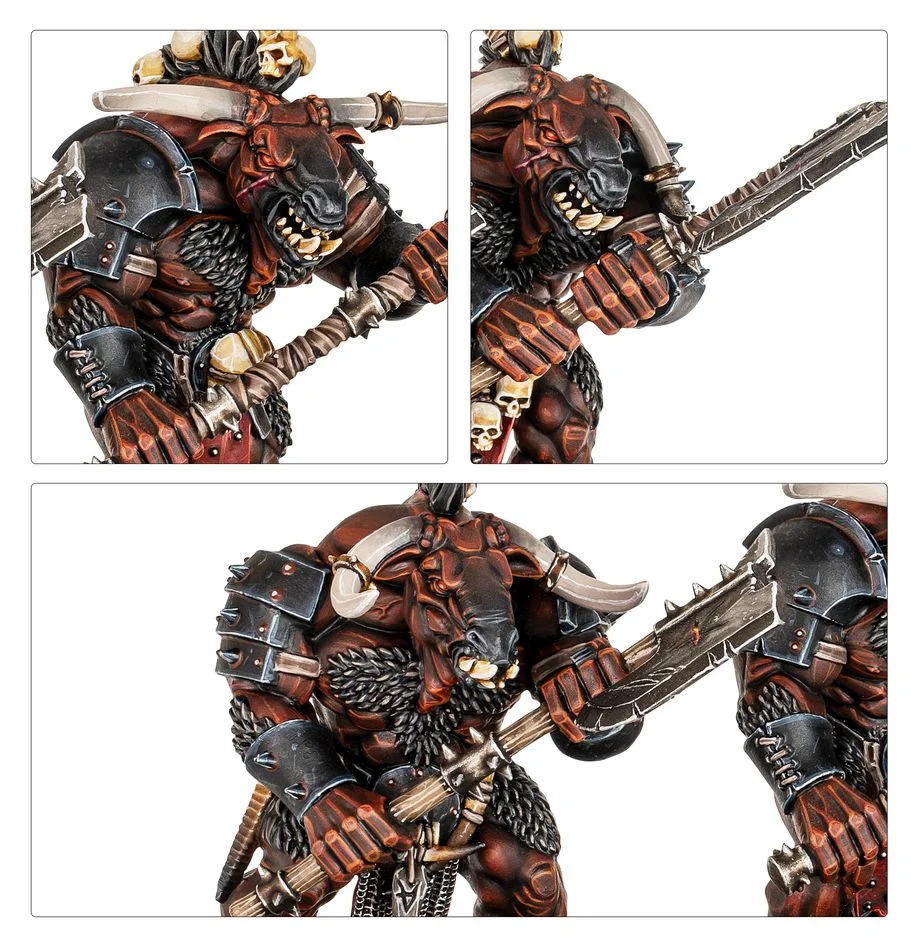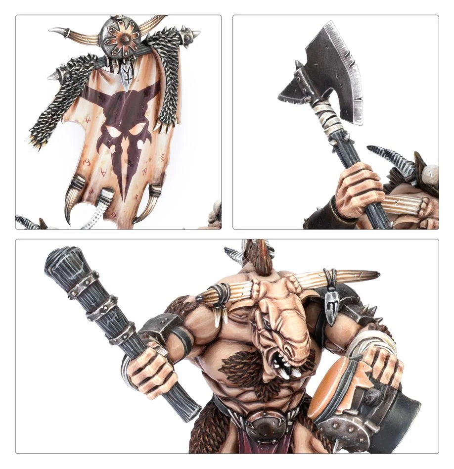 These hulking brutes can be armed with great weapons, a pair of hand weapons, or a hand weapon and shield for extra durability. There are also parts to build an optional champion, standard bearer, and musician. The standard bearer has a choice of two different banner toppers, and the six sets of horns, five heads, five manes, weapons, and shields in the kit are interchangeable across the bodies, making it easy to customise your units.