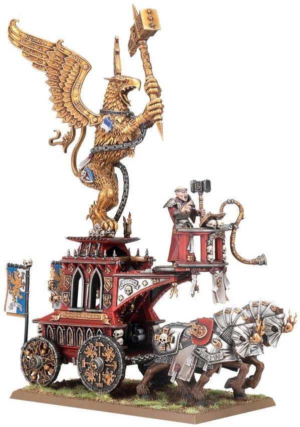 A War Altar of Sigmar is one of the most inspirational sights for the devout citizens of the Empire. Within the armoured pulpit, a Lector of the Cult of Sigmar can deliver their sermons, even in the heat of battle, and extol their followers to greater fervour.