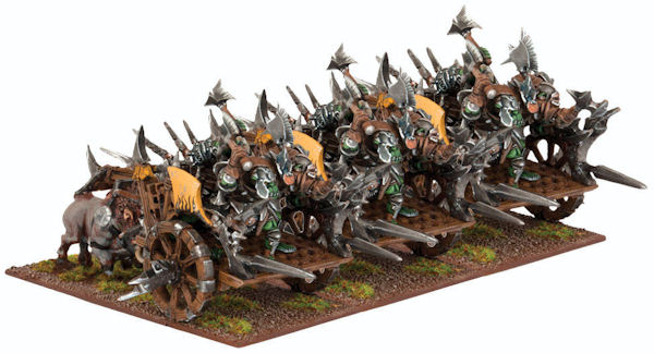 Orcs often mimic the ideas of the other races when constructing weapons and war machines, but often they will add their own unique take to deliver something different. Thus are born contraptions such as the fight wagon. Whereas a chariot can hit hard and fast, aiming to smash a hole in the weak point of an enemy line, a Fight Wagon take a slower approach, driving a group of Morax towards the foe on a raised and spiked platform, their axes threshing a path through densely packed infantry and cavalry. There is never a shortage of Morax volunteers to serve on Fight wagons, and any who face them will not soon forget the experience - in the unlikely event that they live. This set contains 3 multi-part plastic Fight Wagon miniatures, including: - Ax Crew - Scythed Wheels - Gores - 50x100mm Bases - Mantic Points Supplied unassembled and unpainted.