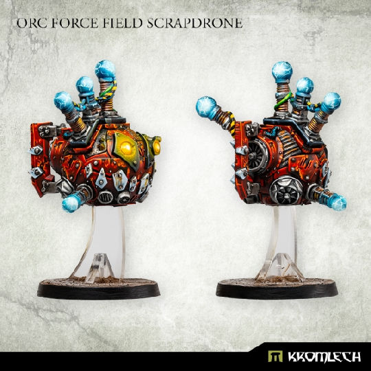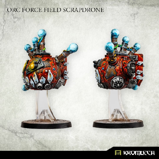 Orktober 2021 release Shield Drone is a concept stolen by Mech Boss Dreadsmasha from an enemy alien race. Personal force field able to protect an orc from enemy fire was introduced once before, but it was never adopted as a long term solution. This set contains one multi part high quality resin model of Orc Force Field Scrapdrone, with five coils to emit the forcefield. Includes 40mm plastic base with clear acrylic flying stand. Designed to fit 28mm heroic scale wargames.