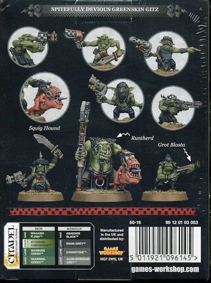 Förpackningen innehåller delar för att montera 10 Gretchin plus en Ork Runtherd. Det ingår ett flertal varianter på delar så du kan skräddarsy din Gretchin-hord som du vill.
