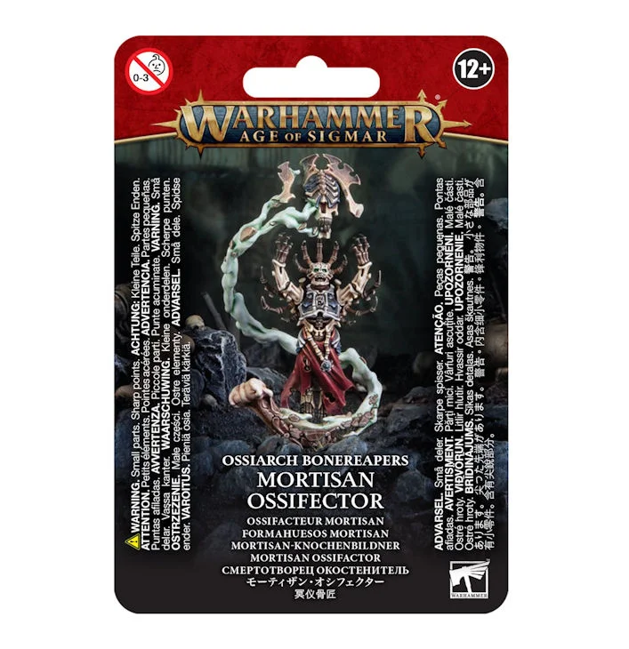 This multipart plastic kit builds a Mortisan Ossifector, an arcane sculptor of mighty bone constructs. This grisly artificer is suspended in a cloud of sorcerous bone-dust, its claws outstretched as it works on a half-assembled Morghast – one of the powerful creations it augments in battle.