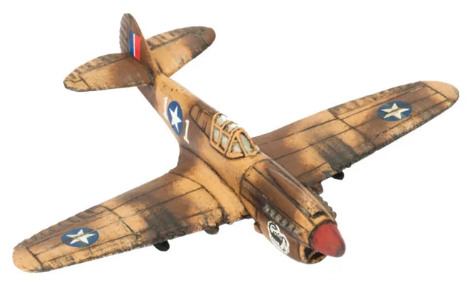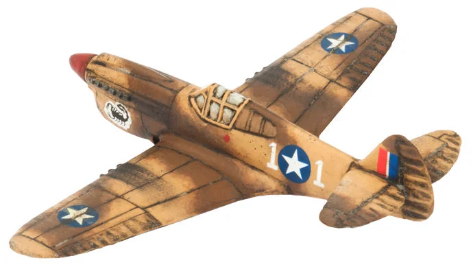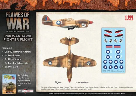 includes two metal and resin P40 Warhawk Fighters, two plastic flight stands, one decal sheet and one Unit card.