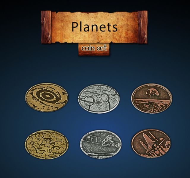 Includes 24 coins: 10 copper, 8 silver and 6 gold coins. Coins fit for intergalactic trading with creatures of all shapes and sizes.