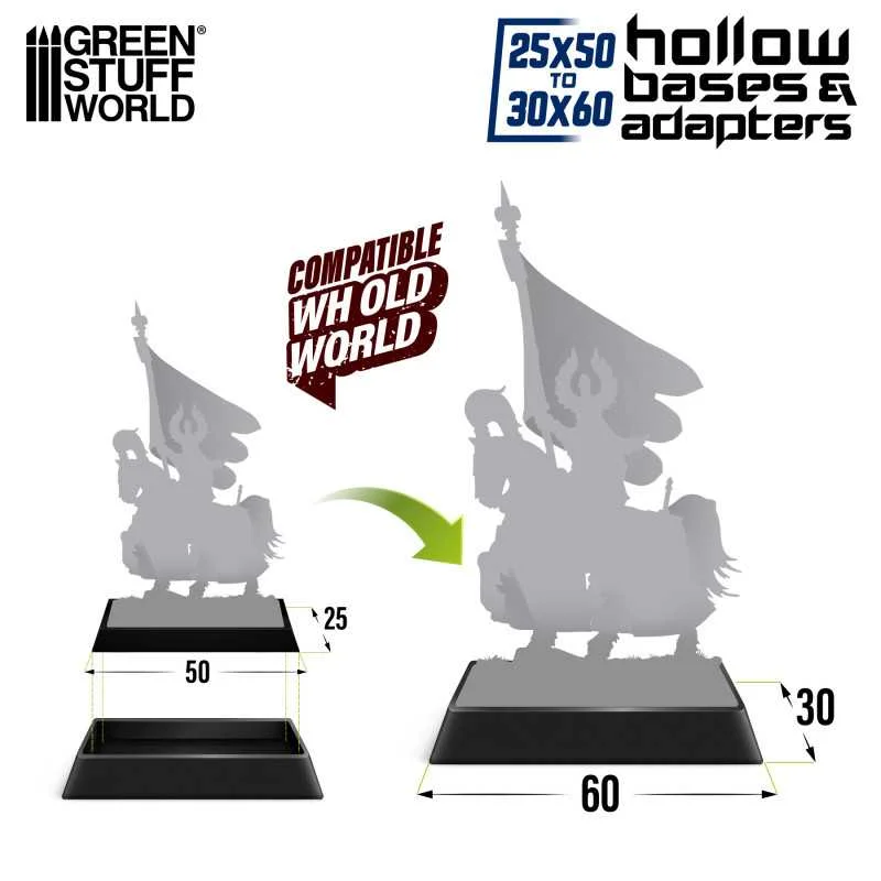 Additionally, they can serve as 25x50 to 30x60mm base adapters, allowing you to convert 25x50 mm to the larger 30x60 mm size. This feature is particularly useful if you use them as adapters for Warhammer the Old World bases, where the need to use old miniatures becomes a reality.