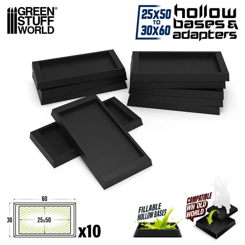 Green Stuff World's Hollow Plastic Bases 30x60mm offer a unique and creative solution for adding dynamic water terrain effects to your wargaming and tabletop miniature collections. They have been designed with a beveled edge and a hollowed-out interior to allow for water or swamp-themed terrain effects, giving the illusion of miniatures being partially submerged in water or wading through a swamp.