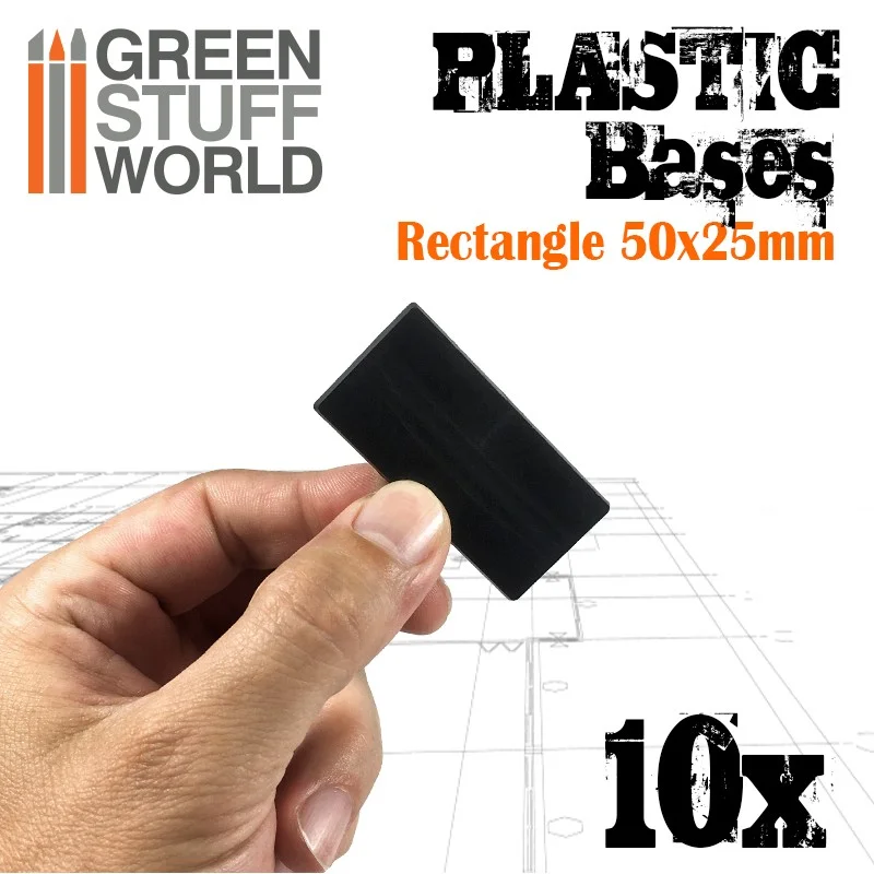 Plastic Rectangular Bases 25x50mm Top-quality plastic bases for mounting wargames figures. Shape: Rectangular Thickness: 3mm Bases: 10 per pack