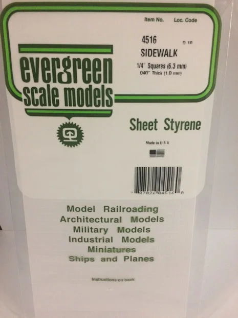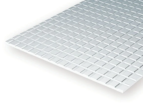 PLASTICARD PLATTOR RUTMÖNSTER SIDEWALK 6.3x6.3 mm 350x150 mm 1 mm tjock (1) Plasticard - ett otroligt mångsidigt material för byggprojekt inom de flesta hobbyområden som miniatyrbygge, terrängskapande, modelljärnvägar, militärmodeller, skalmodeller inom flyg, båt, arkitektur, militära modeller mm mm - endast fantasin begränsar. Materialet är styrenplast, Polystyren på fackspråk. Kan limmas med vanligt plastlim mot liknande plast eller superlim mot andra ytor som trä, metall, papp etc. En kort instruktion samt skaltabell medföljer alla plattor och större förpackningar.