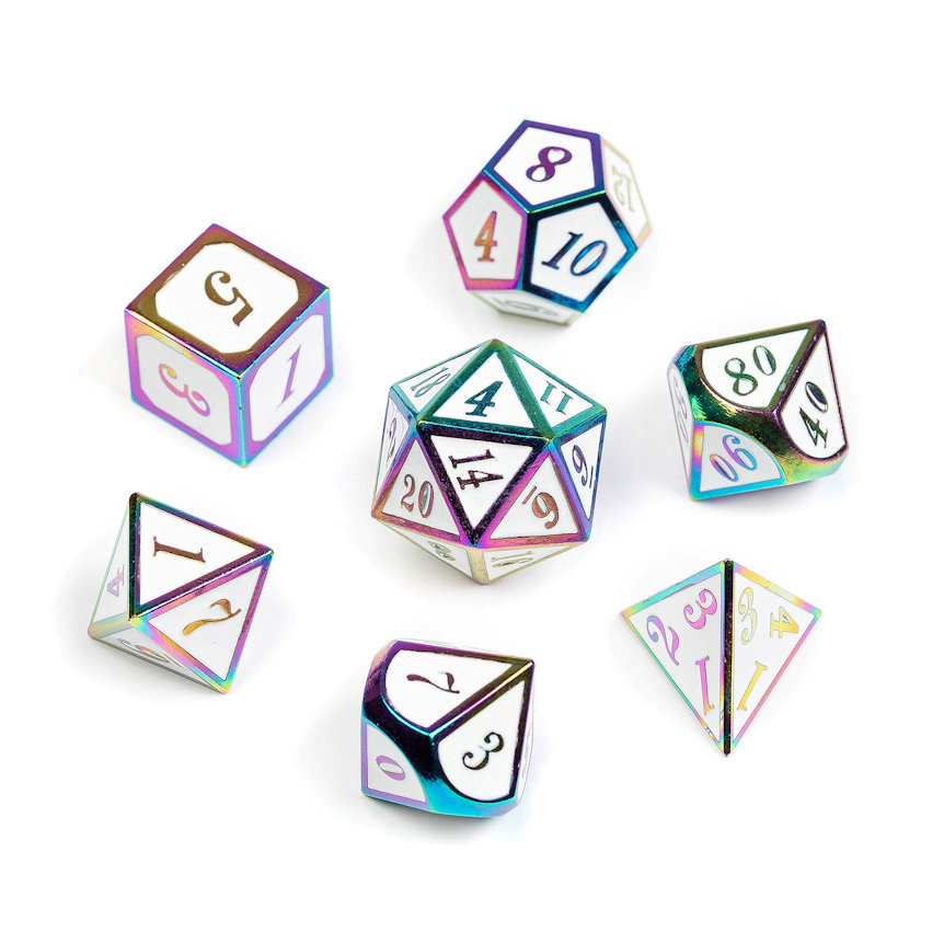 The Greifenfels Rainbow Series are single colored metal dice with multicolored Rainbow edges and numbers. This set contains seven 16mm-dice: D20 D12 D100/10 D10 D8 D6 D4 and is made of solid metal.
