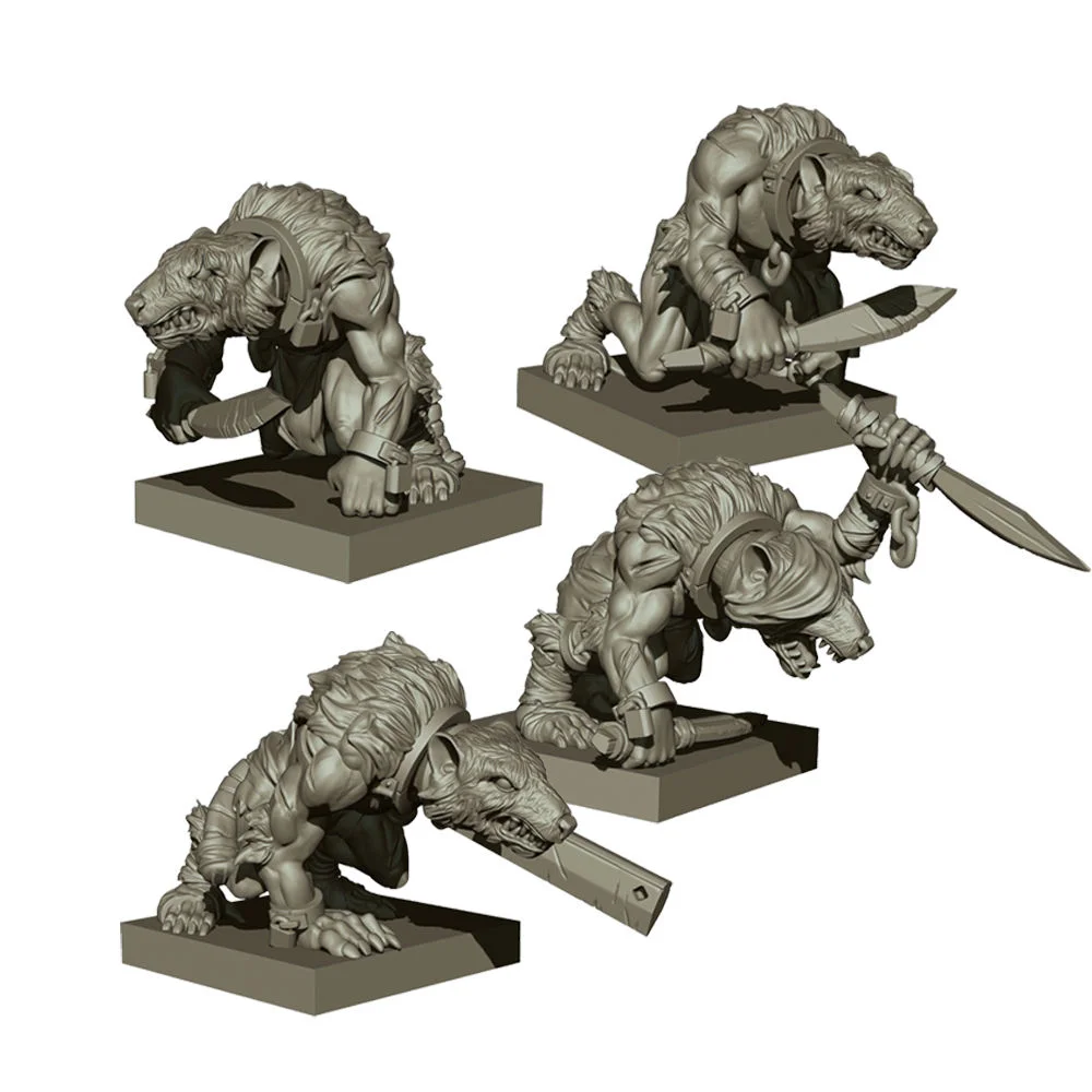 The Ratkin are a slave race created by the Abyssal Dwarfs. They were designed to be hard working, numerous and expendable. They were the perfect servants for their master until a significant number broke their bonds and escaped into the wider world. Not all Ratkin were so lucky, as thousands still serve and slaves or fodder at the behest of the Abyssal Dwarfs. Contents: -4 metal Ratkin slaves. Bases and cards
