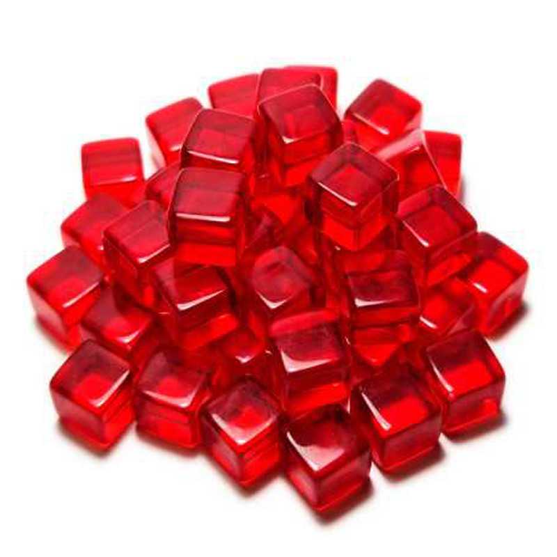 Cubic transparent tokens for Board Games made of transparent acrylic colored plastic. They have a polished finish with semi-rounded corners that are pleasant to the hand. This series of cubic meeples are at a size of 8x8x8 mm, and colored in red, blue, yellow, and green. This set includes 50 tokens