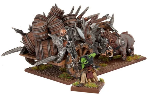 Product Type: Plastic Resin and Metal Miniatures Unit Type: Monster Drawing the lots for the crew of the Blaster is nerve-wracking for the Red Goblins. The plan for the operation of this war engine is to roll it as close as possible to the enemy, and then light the fuse and run for cover. Sounds simple enough, but all too often the fuse proves a bit temperamental… leading the Goblin operator to either an explosive death or a more comical one at the hands of some very scared and very vindictive enemy warriors. This Veteran Conversion Kit contain 1 Orc Gore Chariot, 1 sprue of plastic Renedra Barrels and 1 metal Goblin Operator •1 Sprue of Renedra Barrels •1 Metal Goblin Operator •1 Plastic Resin Chariot •100mmx50mm Base •Mantic Point