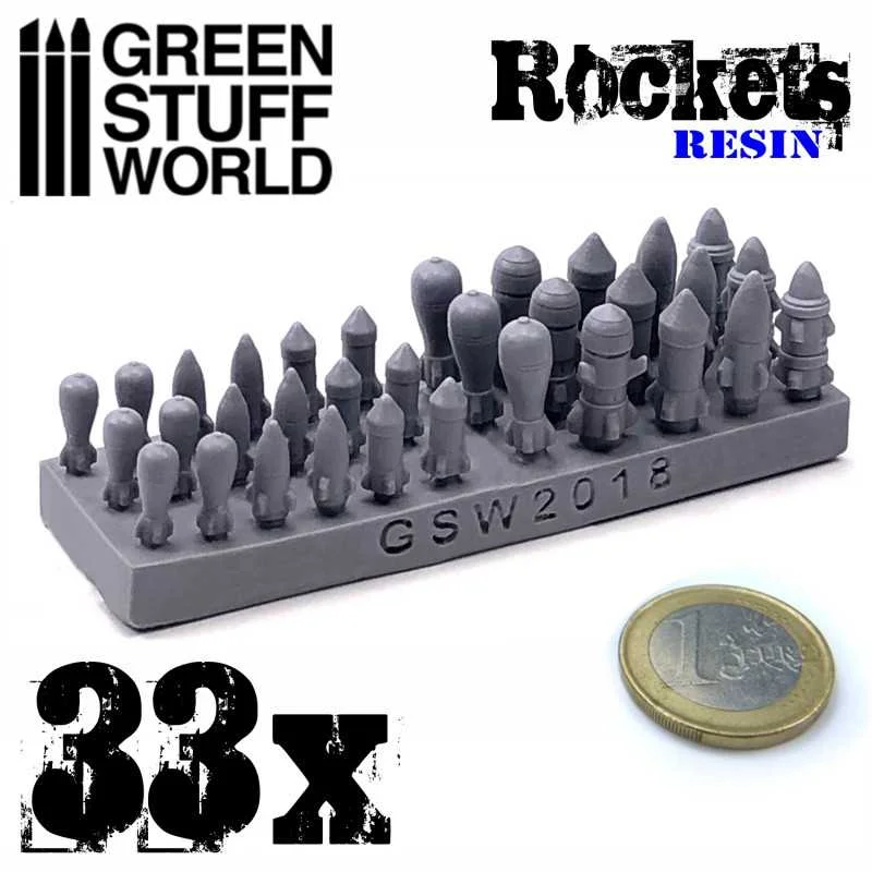 The plaques contain 33 Rockets and Missiles cast in high quality resin. The perfect accessory to turn every scenery into a warzone. This product comes unpainted and it is perfect for 25-28-35 mm miniatures (1:76, 1:48, 1:35). Sizes: 8mm height the small missiles and 12mm height large missiles Each set contains 33x Resin Rockets and Missiles.