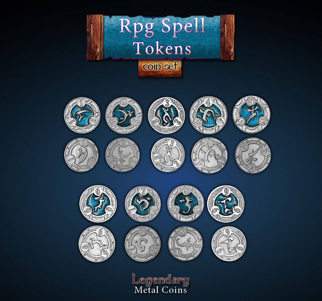 Each RPG Spell Tokens set consist of 22 coins, including 4 coins marked “1”, 3 coins marked “2”, 3 coins marked “3”, 3 coins marked “4”, 3 coins marked “5”, 2 coins marked “6”, 2 coins marked “7”, 1 coin marked “8” and 1 coin marked “9