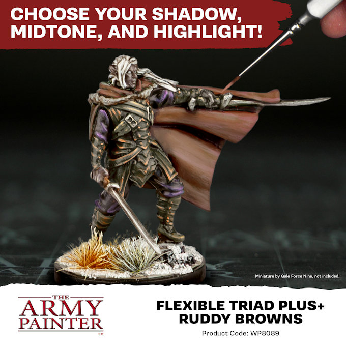 The Flexible Colour Triad System is a segment, or family, of six colours that range from dark to light with a consistent hue. This system allows you to easily select paints that create a natural colour progression on your miniatures. This paint set features not only the complete Ruddy Browns Triad, but also comes with a seventh complimenting colour, Banshee Brown, designed with John Blanche for the Masterclass Series by The Army Painter.
