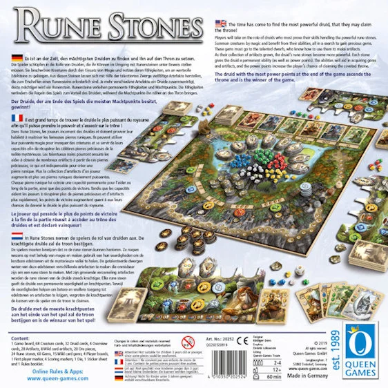 Rune Stones is a deck-building, hand management game by acclaimed designer Rüdiger Dorn. In Rune Stones, every card has a unique number on it. Two cards are always played together, and the higher numbered card is removed from the player's deck. You have to be careful which cards you buy and how you play them to not lose your best cards. Players will use their cards to gather gems, forge them into Artifacts, then combine those into Rune Stones, which grants a special ability for the rest of the game. The more artifacts used in making a Rune Stone, the more points it scores, so players must decide whether it is best to gain abilities early or save to score more points.