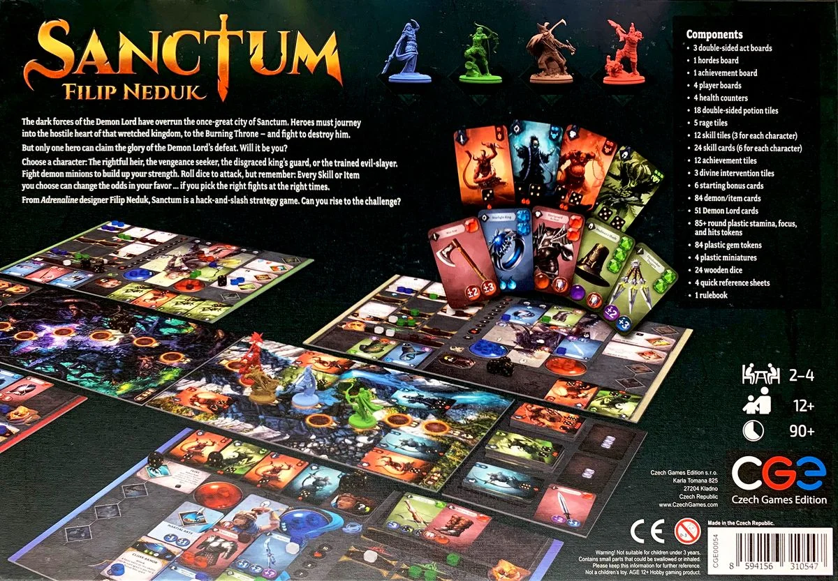 Sanctum is an epic adventure competitive game for 2-4 players that's inspired by the hack & slash genre and converted into a modern board game. As one of the heroes, you embark upon a quest to rid the land of a demonic invasion, fighting your way through countless enemies and gearing up to face the Lord of Demons himself. In the process of venturing deeper into the land, ever so much closer to the Demon Lord, the heroes have to improve their equipment and adapt their combat tactics to face the increasing difficulty of combat.