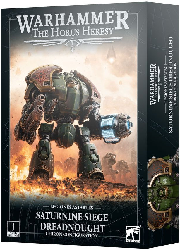 This multipart plastic kit builds one Saturnine Siege Dreadnought, a powerful engine of war for Legiones Astartes armies in games of Warhammer: The Horus Heresy. Their thick armour and advanced shielding soak up remarkable amounts of incoming firepower, making them incredibly difficult to take down. The Chiron configuration is armed with both an infantry-blasting heavy plasma bombard and armour-melting disintegrator cannon, as well as a choice between chest-mounted photonic incinerators or concussive resonators.